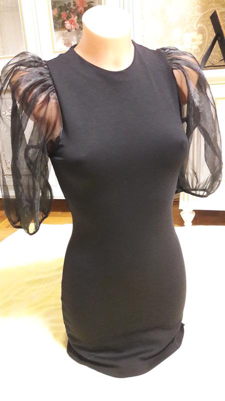 Платье из гладкого трикотажа с шифоновыми рукавами Отличное качество и состояние Размер указан eur XS Полуобхват талии 38 см Полуобхват талии 30 см Полуобхват бедер 38 см + тянется до 8 см Длина 78 см