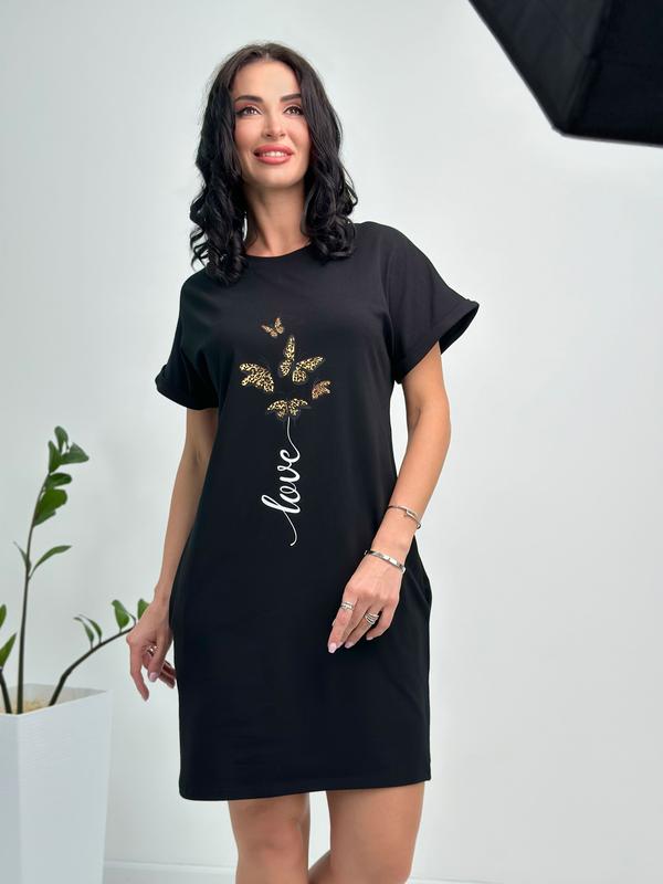 Летнее платье мини с принтом ✔️натуральная хлопковая ткань ✔️фасон и крой платья выгодно скрывает мелкие недостатки фигуры ✔️широкая палитра цветов и размеров 🌈Цвета: черный, джинс, зеленый, мокко, бежевый, серый, графит 🧷Размеры: 42-44, 46-48, 50-52 🪡Материал: турецкий кулир (95% хлопок, 5% спандекс) 📏Замеры: Длина по спинке: 91-93 см Длина рукава от горловины: 30-31 см Модель 8581 Ф