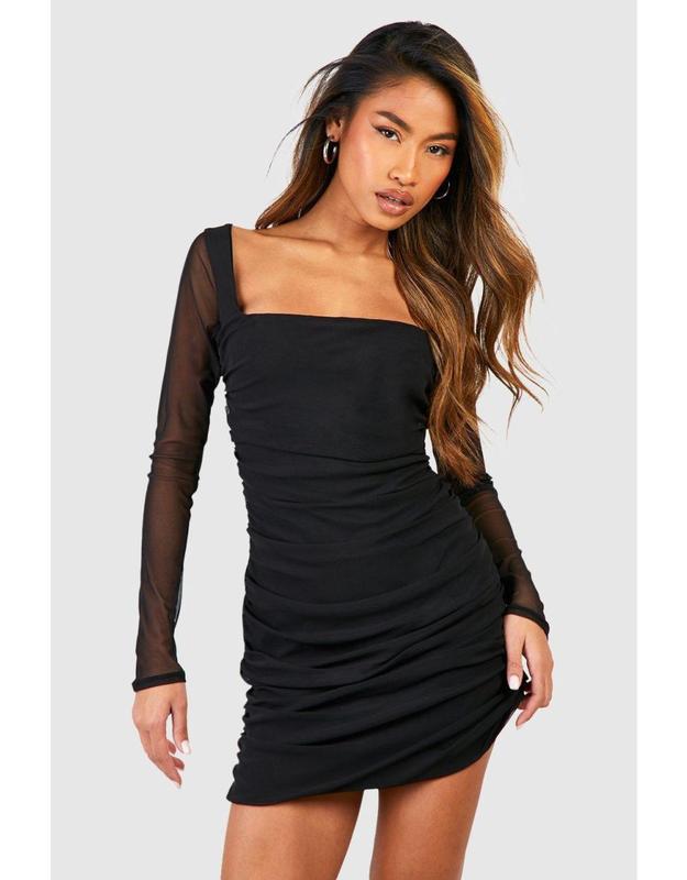 Черное платье с драпировкой и сеточкой/с прозрачными рукавами/с квадратным декольте