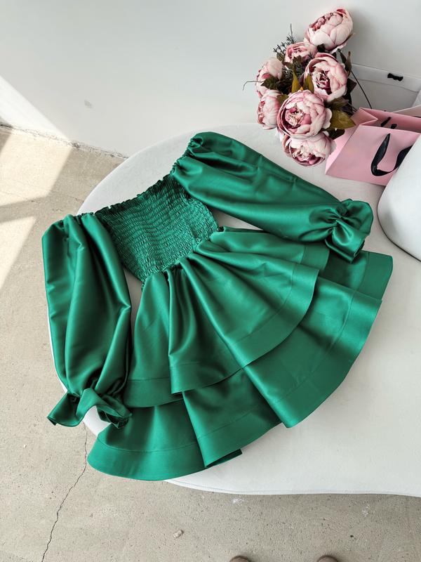 Атласна сукня коротка пишна на резинці з довгим рукавом зелена з відкритими плечима з атла...