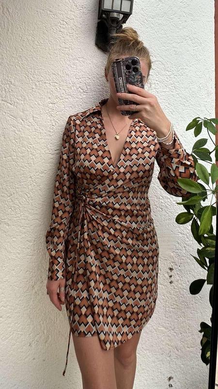 Коричнева сукня у геометричний орнамент. Сукня на запах із завʼязками Розмір S-M