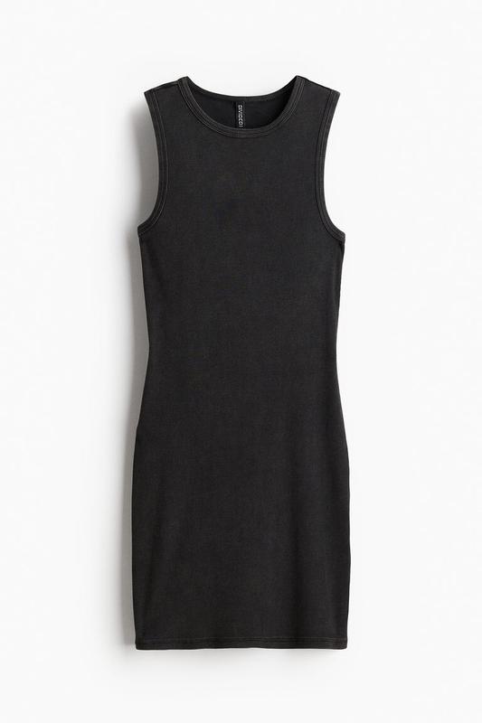 94% бавовна, 6% еластан СУКНЯ-ФУТЛЯР У РУБЧИК. Короткое, приталенное платье без рукавов из трикотажного полотна в рубчик с круглым вырезом и узкой отделкой по горловине и проймам. Прямой крой подола. Ширина плеч 23см, полуобхват груди 23см, длина изделия 78см. Без бумажной бирки.