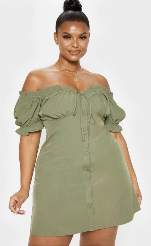 Платье хаки свободного фасона под грудь PLT Вещь новая! Размер-20 Пог-56 тянется до 69 см Пот-55 см Поб-66 см тканина тягнеться. По верху идет хорошо фиксирующая резинка; также рукава, можно носить приспущенные/ или на плече. Красивая ткань, не просвечивает, присоединительную выглядит отлично!