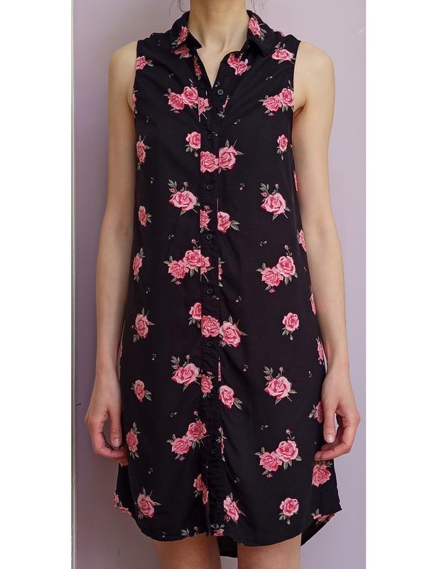 Легкое летнее платье Divided из вискозы с принтом розовые розы на черном фоне. Прямой фасон без подкладки, с воротничком, полностью застегивается на пуговицы. Без пояса . Параметры Полуобъем: Плечи - 31 см Груди — 41 см Длина - 87см Состояние - отличное.