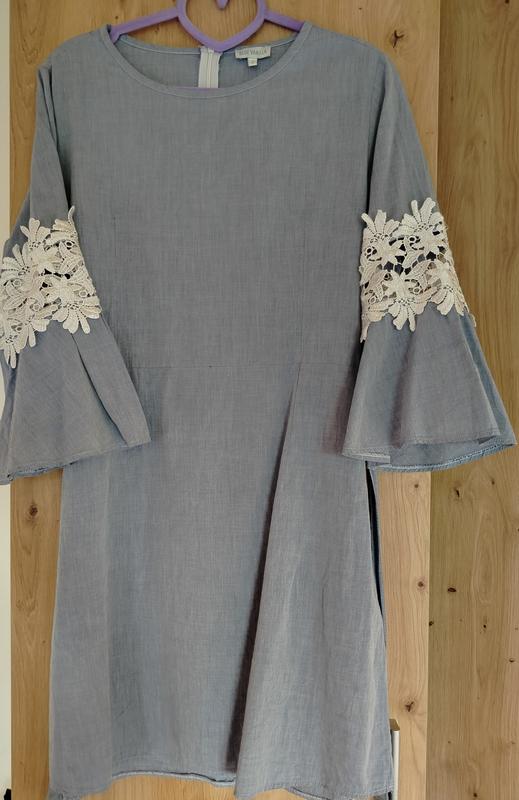 Женское платье в нежном голубом цвете бренда Blue Vanilla. Платье на размер M. Можно носить как с поясом, так и без. Ткань-100% хлопок, очень приятная к телу, не жаркая. Платье имеет шикарные рукава отделанные кружевом. Стан идеален, без дефектов.