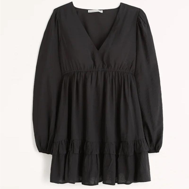 V-образний виріз, висока талія, міні/міді сукня, довгий рукав, сукня з двома внутрішніми карманами. В складі переважає віскоза. Колір сукні чорний (не посидів) На фото є синя сукня, але то для візуалізації як сидить