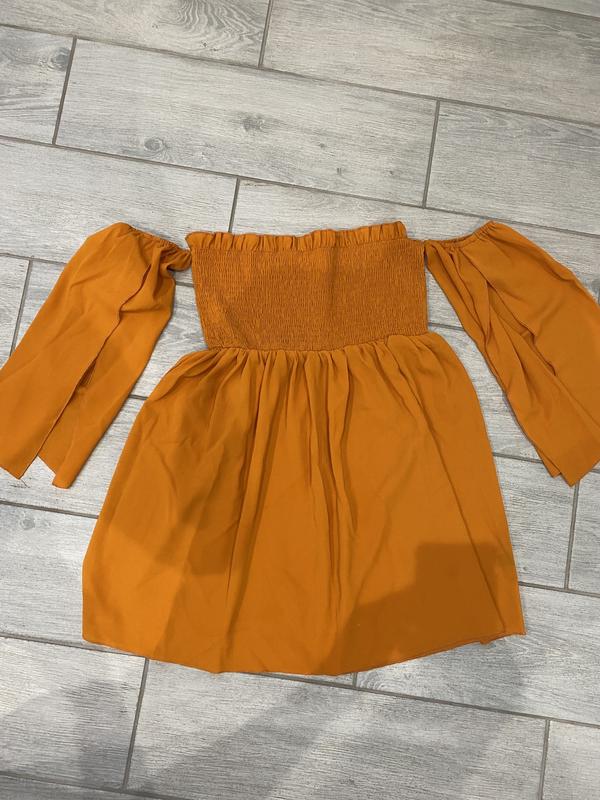 Розмір М, L 40/42 Тримається на грудях на резиночці Рукава не закривають плечі Обхват грудей 70 см Обхват по талії 68 см Довжина 65 см Рукавчик з розрізом Дуже легеньке, літнє Яскравий помаранчевий колір