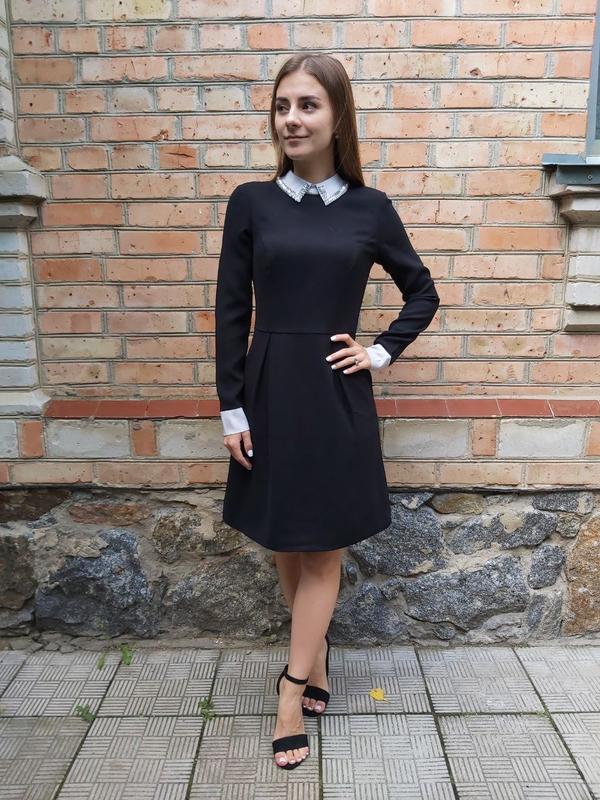 Вишукана сукня з якісної тканини, підклади та фурнітури. По комірцю розшите каміння, є кишені. Сукня гарно підкреслює фігуру. Розмір S