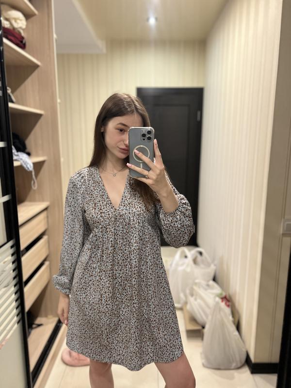 Сукня розлітайка за рахунок такого фасону підійде навіть на розмір M та для вагітних, бо доволі широка Я розміру S Стан ідеальний, немає дефектів Тканина не мнеться, прасувати не потрібно, що дуже зручно, синтетика, але при температурі +25 влітку не було сильно жарко