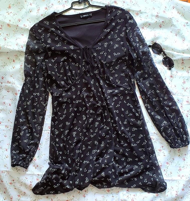 Легка чорна сукня в сіточку з підкладкою, візерунок квіти розмір XL довжина 84 см,рукав 61 см, пог 43 см