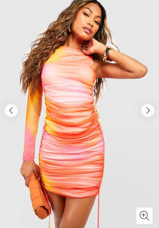 Классное , яркое , фирменное платье-сетка , в оборках , очень хорошо тянется как резинка , на теле длиннее чем на фото где девушка в нем , с одним рукавом , платье по всей длине с подкладкой . Плечи 32 см , ПОГ 40 см , ПОТ 32,5 см , ПОБ 39 см , Длина рукава 59 см , Длина 88 см .