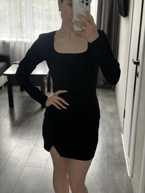 Черное мини платье с вырезом и молнией на спинке Длина 79см Длина рукава 62см Полу обхват груди 42см но красиво тянется Полу обхват талии 35см Полу обхват бедер 45см