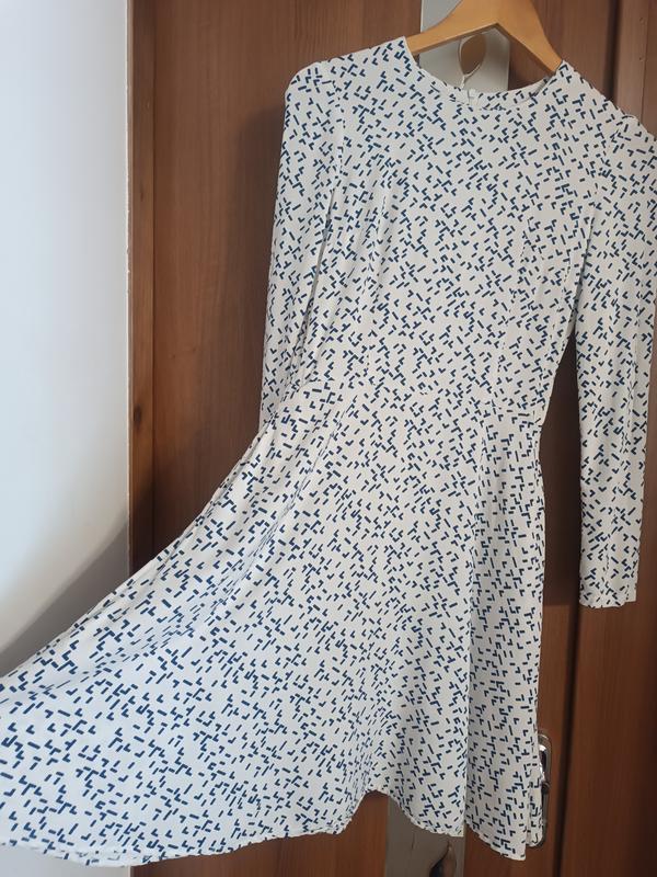 Платье мини приталенное белое в темно-синий принт,очень удобное. Материал вискоза,штапель на ощупь и извне. Размер 34 XS. В идеальном состоянии надевала два раза