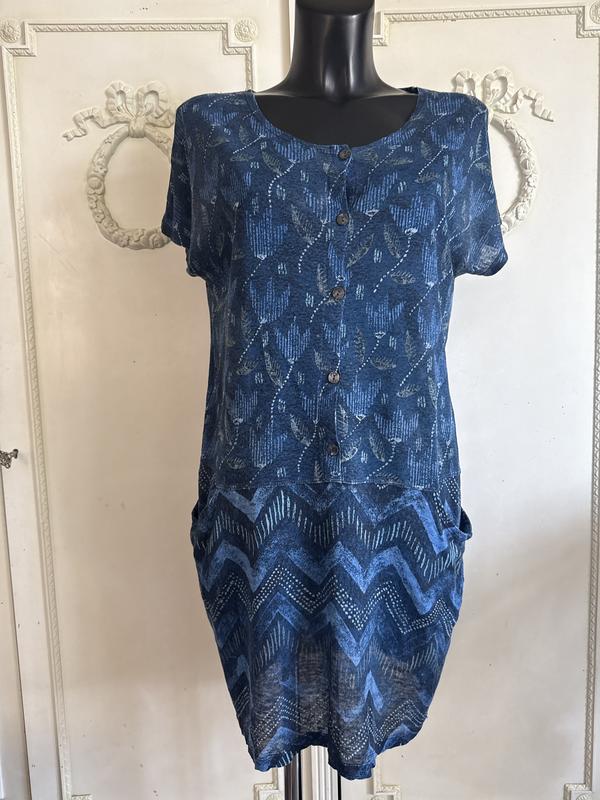 Легка якісна сукня з льону-100/. Застібка-ґудзики до лінії бедра, два кармани. Розмір по бірці-S. Заміри: довжина-85 см, ПОГ-45см, ПОБ-50 см.
