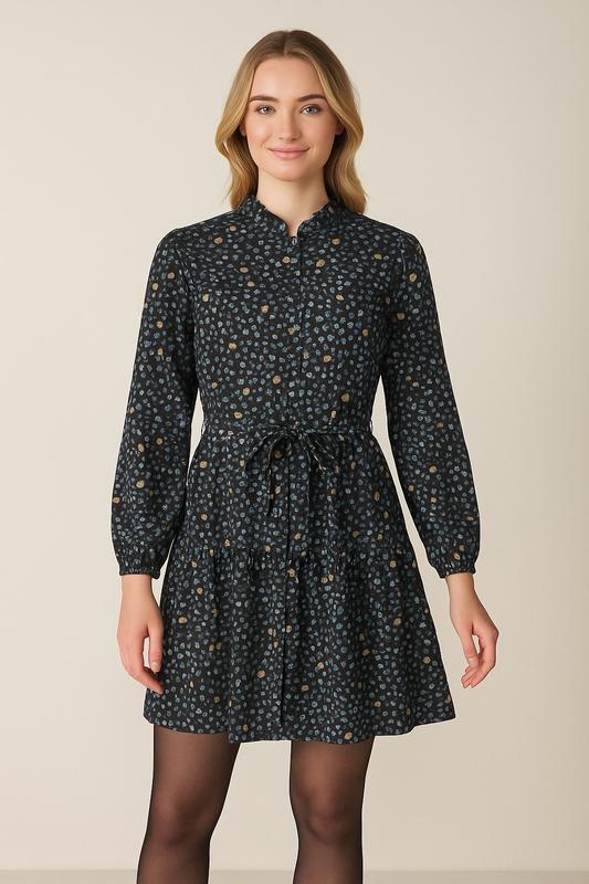Жіноча сукня з дрібним принтом — стиль і комфорт на кожен день Ця витончена сукня з м’якої тканини і дрібним принтом — ідеальний вибір для осені, весни чи навіть зими в поєднанні з колготками. Модель має довгі рукави з манжетами, комір-стійку та зав’язку на талії, що дозволяє підкреслити фігуру. Нижня частина оформлена легкою оборкою, яка додає руху і жіночності силуету. Деталі: • Колір: темний фон з дрібним принтом у синьо-коричневих тонах • Довгі рукави з резинками • Комір-стійка • Пояс-зав’язка на талії • Легка оборка знизу • Довжина — міні Універсальна модель, яка чудово поєднується з чоботами, кросівками або лоферами. Ідеальна як для офісу, так і для повсякденного міського стилю.