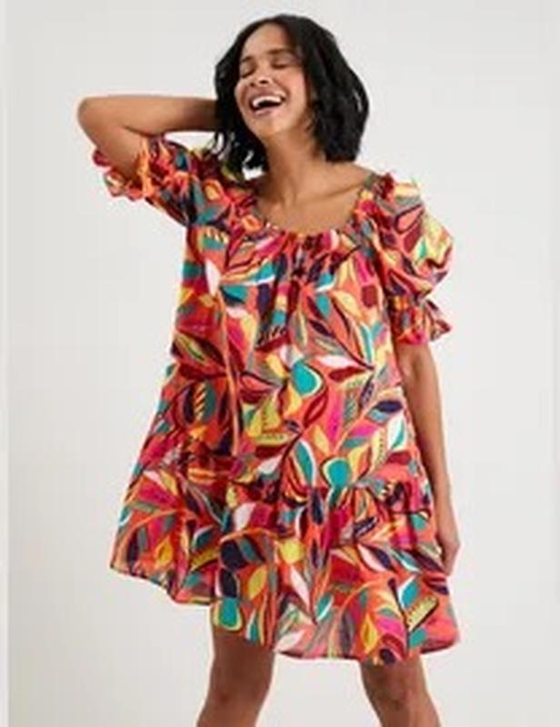 Яскрава сукня з натуральної тканини від tu. Стан нової речі. Красиві насичені кольори. Тканина легка, приємна, комфортна, натуральна. На натуральній підкладці.Рукава об'ємні на резинці з оборкою. На плечах і по вирізу резинки. По низу широка оборка. Крій вільний, для літа ідеальний. На бірці розмір 20.