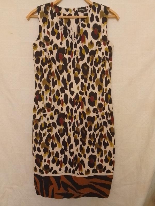 Платье льняное женское приталенного кроя с леопардовым принтом бренд POMODORA размер S. Замеры: полу объем груди - 44 см, полу объем талии - 41 см, полуобъем бедер - 48 см, длина изделия – 100 см. Застежка: потайной замок длиной 53 см. Особенности: Платье без рукавов. С карманами. На натуральной тоненькой подкладке по всей длине. Сезон: лето. Тканина: льон 15%, бавовна 85%. Принт: тигровый. Новое, без бумажной этикетки, без дефектов.
