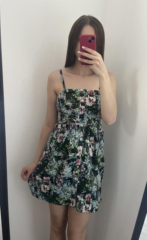 Стан ідеальний, дефектів немає. Спинка резинкою, спереду ґудзики обманки. Шлейки можна відчепити, на грудях прорезинений край, тому сукня не буде спадати навіть без шлейок На підкладці На розмір XS-S Заміри: Довжина від грудей 70 см. Напівобхват грудей 40 см. Напівобхват талії 34 см.