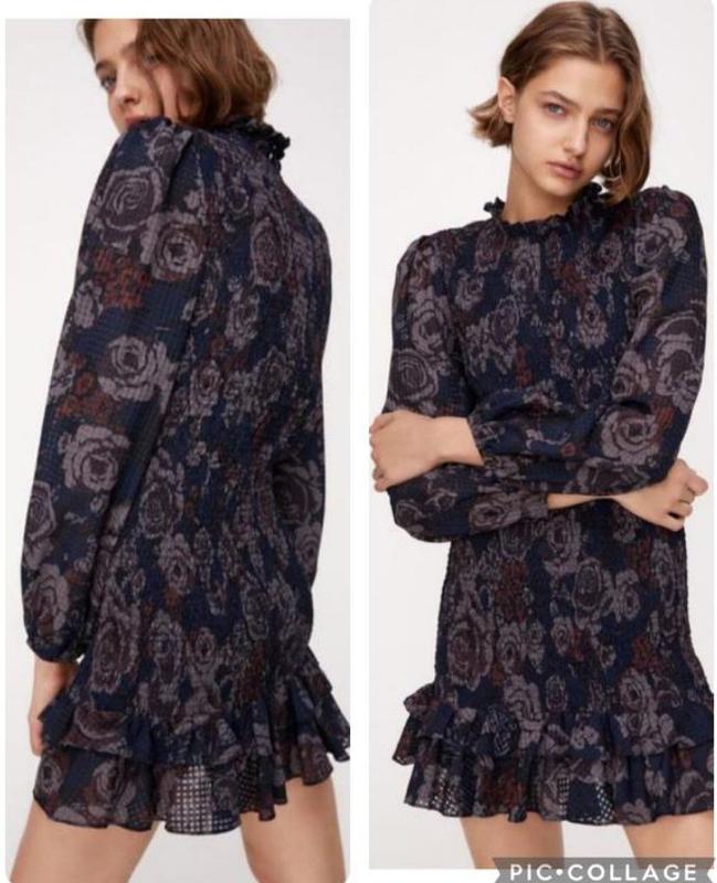 Міні-сукня від іспанського бренду ZARA. Прямий сілует. Колір глибокий фіолетово-синій із сірим. Оригінальний принт у піксельні троянди. Сукня еластична, подол спідниці з двома воланами, грайливий комірець з маленькім воланом, обтислий сілует врівноважує широкий рукав з напівпрозорої тканини. Застібається позаду на гудзик. Сукню можна вдягати в двох варіантах - без поясу та с контрастним широким шкіряним поясом. Цікаво та стильно виглядає у комплекті зі щільними кольоровими або чорними колготками та брутальними чоботами або лоферами. Розмір - M (EUR, USA). Завдяки особливостям фасону та тканини ідеально сідає на M та на S. Довжина - 82 см. Ширина плечей - 37 см. Довжина рукава - 58 см. Об'єм грудей - 75 см (в стягнутому стані). Об'єм грудей - 110 см (в розтягнутому стані). Об'єм талії - 70 см (в стягнутому стані). Об'єм талії - 100 см (в розтягнутому стані). Об'єм стегон - 80 см (в стягнутому стані). Об'єм стегон - 110 см (в розтягнутому стані). Ширина воланів - 12 см. Тканина - поліестер (100%). Країна виробництва - Індія. RRP (ціна на сайті виробника) - 1569 грн. Сукня нова, без етикеток.