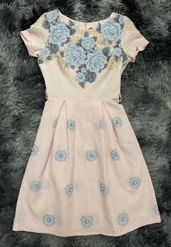Дуже гарна сукня зі структурної ріфльноі тканини Ніжно рожева з блакитними квітами та перлинами Купувала дорого, Італія, але з розміром прогадала Розмір 36 (42-44), підійде на Хс-С Позаду змійка, легка невагома тканина, приємна до тіла, можна під ремінець носити Всі бірки на фото Фото на собі не роблю