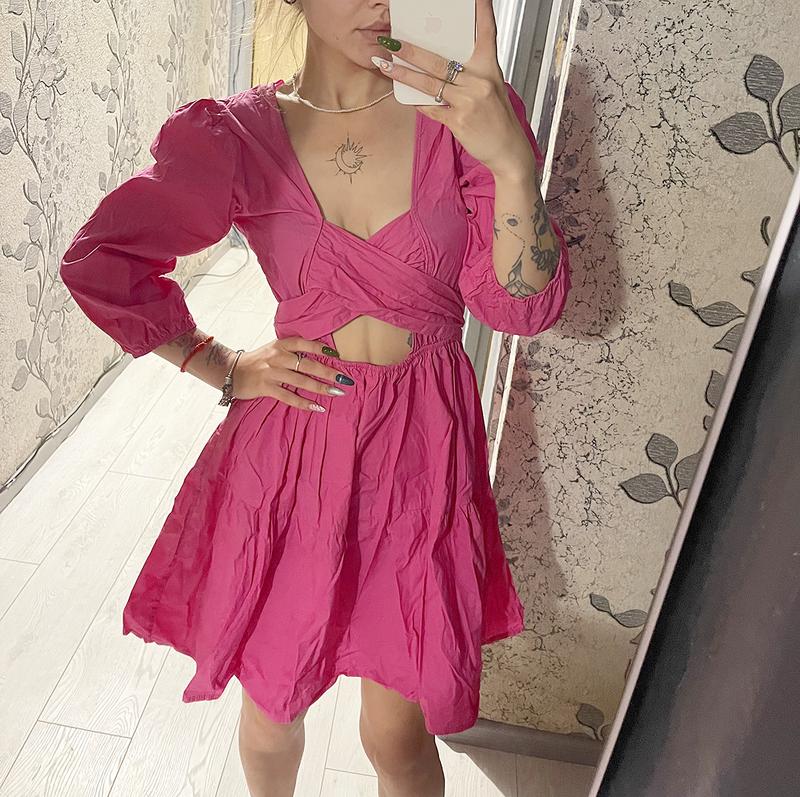 Котонова комфортна сукня з пишними рукавами 3/4, в талії резинка, приємна до тіла, не жарка. Стан 5. Розмір вказаний Л, вдягнуто на С зріст 163 см. Довжина 85 см рукав 44