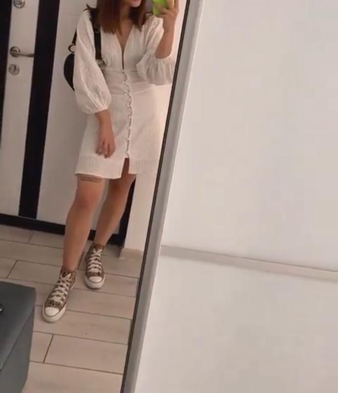 Коротка біла сукня з ґудзиками • Довгий рукав Легка й жіночна коротка сукня білого кольору — базова річ, яка завжди виглядає стильно. Модель із довгим рукавом, застібкою на ґудзики та лаконічним кроєм чудово пасує як для повсякденних виходів, так і для більш особливих моментів. • Колір: класичний білий • Розмір: xs-s • Рукав: довгий, з манжетом