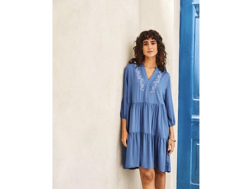 ESMARA Жіноча сукня із віскози від відомого бренду . Сукня вільного крою з легкою та приємною до тіла віскозної тканини . З V - образним вирізом та воланами . З тонкою вишивкою та гумкою на кінці рукавів Рукав 3/4 Матеріал : 100% віскоза ( холодок) Охолоджує в спекотну погоду Не тягнеться ✅Колір : темно - блакитний , як на фото ✅Розмір : М ✅Заміри : ПОГ 56; ПОТ 58; ПОБ 78; довжина 86 см ✅Виробник : Німеччина Дивитися по замірах 👆