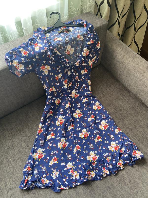 Легка літня сукня в квіточку 🌸 💙 Чарівна синя сукня з яскравим квітковим принтом — ідеальний вибір для літа! 🎀 Модель з романтичними воланами по декольте та низу, що додають ніжності образу. 👗 Облягаючий верх та розкльошена спідниця створюють жіночний силует. 🌬 Легка, дихаюча тканина — комфортна навіть у спеку. Розмір: S (може підійти і на XS) Стан: дуже хороший, без плям і дефектів Довжина: до колін Застібка: збоку Ідеальна для побачення, прогулянки чи літньої фотосесії ☀️