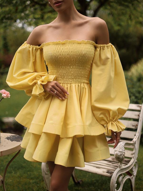 Сукня коротка міні пишна жовта лимонна з довгим обʼємним рукавом з відкритими плечима ллян...