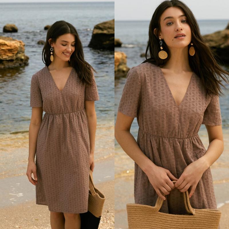 Легкое летнее коричневое платье короткое из прошвы на подкладке 100% хлопок