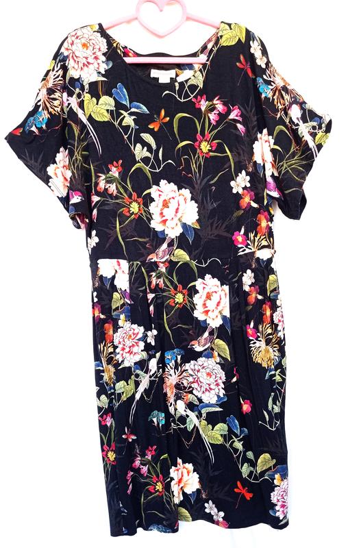 Изысканное, легкое, черное летнее женское платье в цветочный принт. Ловушка в наличии. Общая длина - 96 см. Полуобъем талии - 42 см. Ширина рукава - 26 см. Стан идеален.