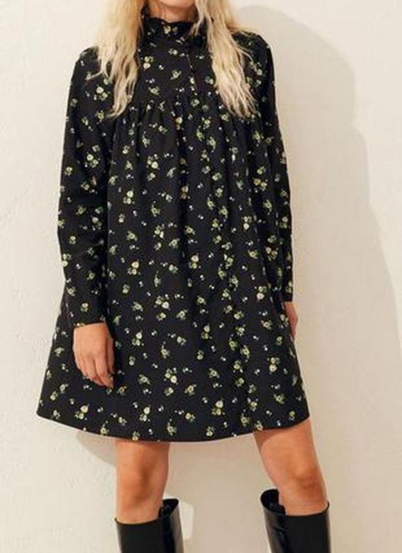 Просьба через кнопку КУПИТЬ оформлять после договоренности❤ Короткое платье H&M прямого пышного кроя из тонкого материала. Высокий воротник с оборками, потайные пуговицы спереди и кокетка. Длинные широкие рукава-буфы и манжеты с коротким разрезом и пуговицей. Без подкладки. Цвет черный в цветочный принт. Фасон оверсайз, на этикетке указан размер М. Новое, без бумажной бирки.