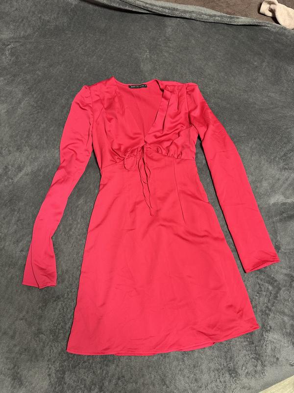 Червоне вечірнє плаття , коротке , з гарним декольте та рукавами
