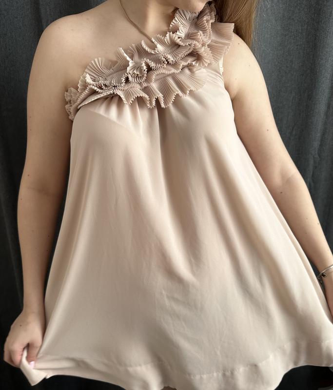 Сукня жіноча на одне плече Тканина шифон Багатошарова (не світиться) Легка, пудрового відтінку) ПОГ - 45см ПОТ - 63 см (розширена до низу) Довжина від плеча- 84см