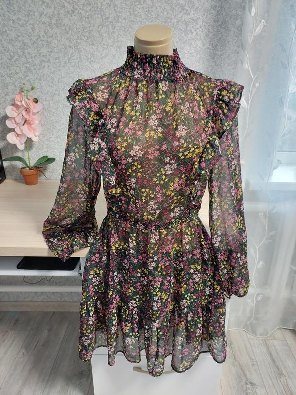 Женское прозрачное мини платье с длинным рукавом и рюшами в стиле бохо, бренда F&F, с полиэстра, размером 14,42-44, М. В идеальном состоянии, не тянется, пояс на резинке растягивается в талии до 51см полуобхват. С цветочным принтом, все замеры на фото, мадес и Индия.