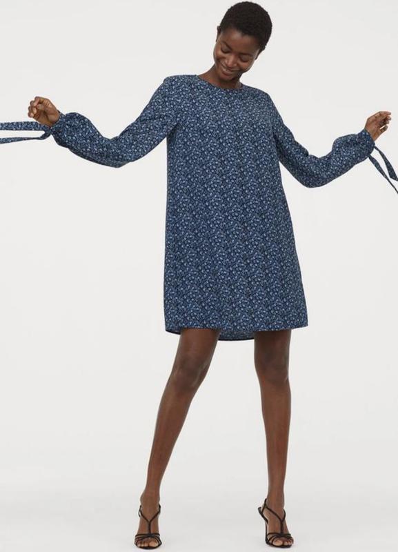 Синее платье свободного фасона в цветочный принт с завязками на рукавах