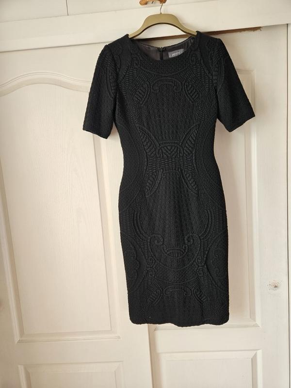 Плаття від бренду per una, розмір указаний 10, або М. Насиченого чорного кольору трикотаж, склад: 77%-акрил, 15%поліамід, 9,%вовна. Підкладка:95% поліестер,5%еластан. Плечі-40см, ПОГ-45см, тягнеться до 50см, ПОТ-35см, тягнеться до 40см, ПОБ-45см, тягнеться до 50см, довжина рукава-38см, довжина виробу -103см, по спинці застібається на змійку, довжиною 57см.
