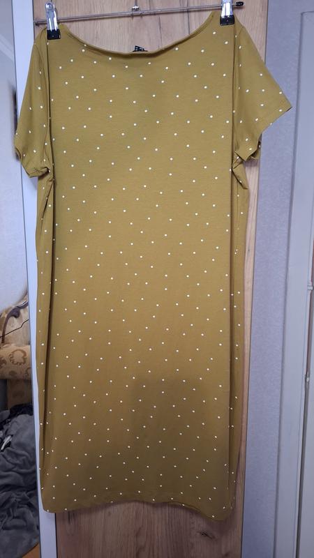 Желтое прямое платье-футболка в горошек. размер - M Полуобхват талии - 50 см Длина - 86 см Полуобхват рукава - 16 см Материал: 95% коттон и 5% элестан