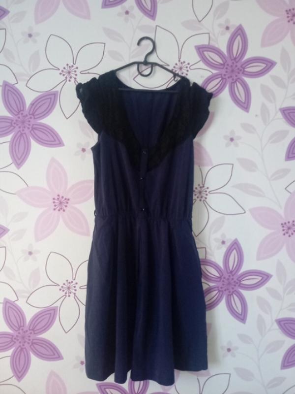 Платье темно синего цвета, есть кармашки по бокам, можно застилизовать любой ремешок, посередине пуговицы, растягивается,этикетку срезали