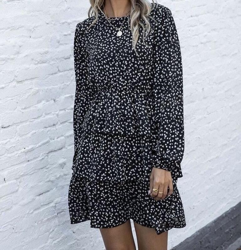 Чорна сукня в квітковий принт з рюшами, розмір L (40/42). Легка міні-сукня А-силуету з довгим рукавом. Ідеально підходить для весни та осені. Матеріал — м’який софт (82% поліестер, 15% віскоза, 3% еластан). Зручна, жіночна та універсальна — чудово підійде також для вагітних завдяки вільному крою.