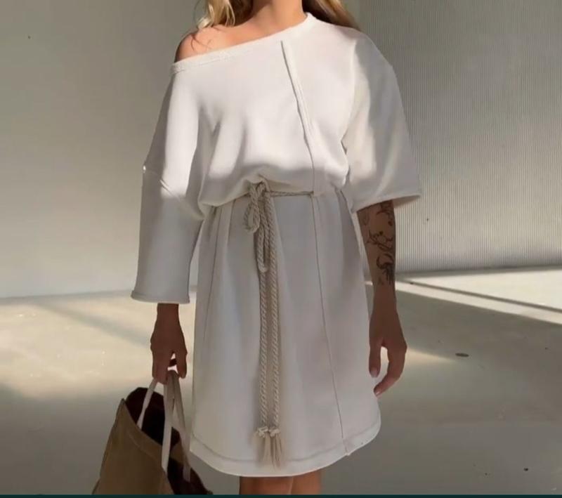 Новое платье молочного цвета с ремнем. Ткань трехнитка премиум качество "пенье". Стильный крой и максимально приятная к телу ткань. Длина 95 см, ширина 58 см. Пасок снимается. Присущая бирка. Подойдет на размер xs-l.