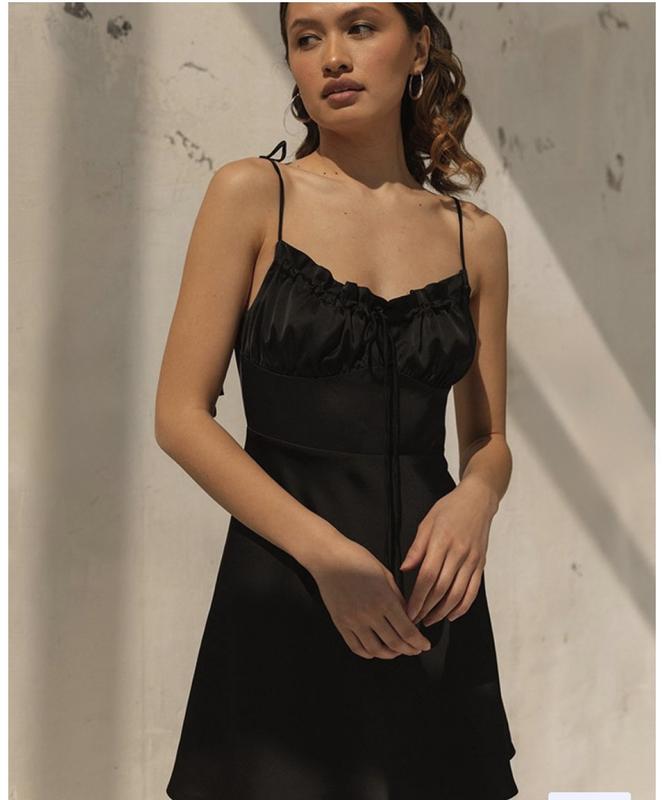 Нова сукня з етикеткою (не підійшов розмір: розмір виробника М, по факту піде на С) Сукня міні, з підкладкою, не просвічується. Зав'язки регулюються. Ззаду застібається на блискавці. Склад: 70% віскоза, 30% бавовна. Матеріал сатин. Колір: чорний Розмір М ОГ 86-92; ОТ 68-72; ОС 92-96 Довжина сукні без зав'язок 67 см, ширина під грудьми 39 см