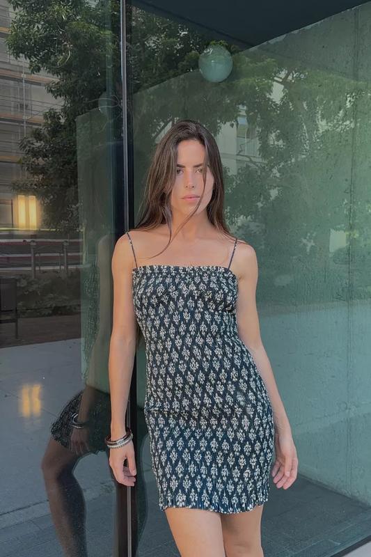 XS-XL Платье с V-образным верхом и тонкими регулируемыми бретелями. Жата эластичная ткань и оборки.