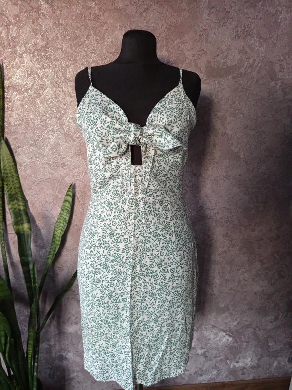 тоненькое летнее сукнкв в размере М, на груди связывается бантик, сзади замок, бретели регулируются. Платье новое но без бирки. Материал полиэстер
