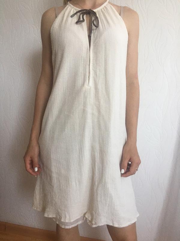Легкое платье из качественных натуральных материалов, отличный вариант на жаркие летние дни Все проветривается, ткань не парит, имеет подкладку, не будет просвечиваться Фасон подойдет на любимую фигуру Размер М, все замеры присилию Цвет молочный Материал хлопок