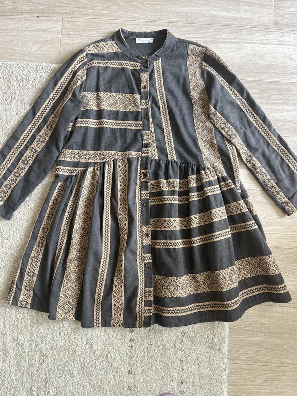 Дуже гарна, якісна сукня. Натуральна тканина, виробництво Італія. Довжина 87, рукав 54, нОГ 52, талія та стегна вільно. Повинна сідати вільно.