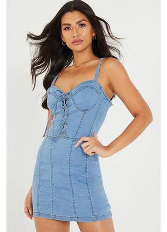 Стрейчевое джинсовое платье с имитацией корсета. Застегивается на замочек сзади. Состав 66% хлопок, 31% полиестер, 3% эластан Бренд Quiz Размер UK 10 S-M