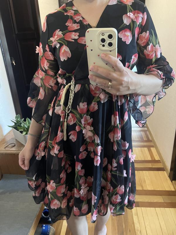 Шифонове плаття в каітковий принт, є нашиті квітки, талія на завʼязку, можна регулювати Трішки вилізла жилка на краях( можна підшити вбо витягнути)