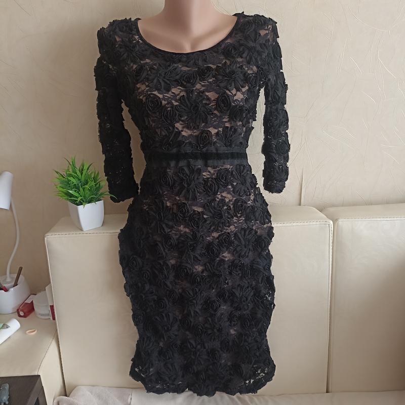 Платье женское черного цвета, рукав 3/4. Сверху кружево, подкладка из вискозы. ПОГ 44-46, ПОТ 37, ПОБ 45, длина рукава 43, длина платья 93. Застегивается с боку на молнию.