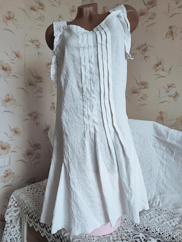 Брендовое белое короткое платье без рукавов из натурального льна. Сбоку на замке для удобной посадки. Прямое, юбка расклешенная , с клиньями в стиле "Годе". Смотрится очень эффектно и стильно. Состояние новой вещи. Следы ношения отсутствуют. Дефектов нет.